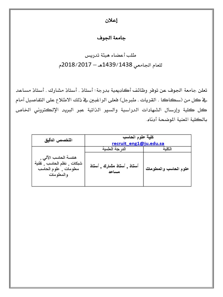 أعلنت جامعة الجوف توفر وظائف أكاديمية بدرجة (أستاذ مساعد، أستاذ مشارك، أستاذ) للسعوديين والسعوديات في كل من (سكاكا، القريات، طبرجل)، وذلك وفقاً للتفاصيل وطريقة التقديم الموضحة أدناه. أوضحت جامعة الجوف من خلال بيان تلقت إخبارية الجوف نسخة منه، أن عملية القبول في كليات الجامعة تتم وفقاً لمعايير واضحة ومحددة ومن أهمها المعدلات وتحقيق الرغبات الشخصية للمتقدمين والمقدمات، لحين الوصول للحد الأعلى. بالشراكة مع جامعة الجوف قسم الموهوبات بتعليم القريات يختتم برنامج (اكتشف العلمي) الإعلام والاتصال ـ القريات : جامعة الجوف جامعة سعودية تقع بين مدينتي سكاكا و دومة الجندل بمنطقة الجوف بالمملكة العربية السعودية وهي تحت إشراف وزارة التعليم و هي جامعة سعودية. (الجوف، سكاكا، القريات، طبرجل) وفقا للشروط والمزايا اللاحقة: